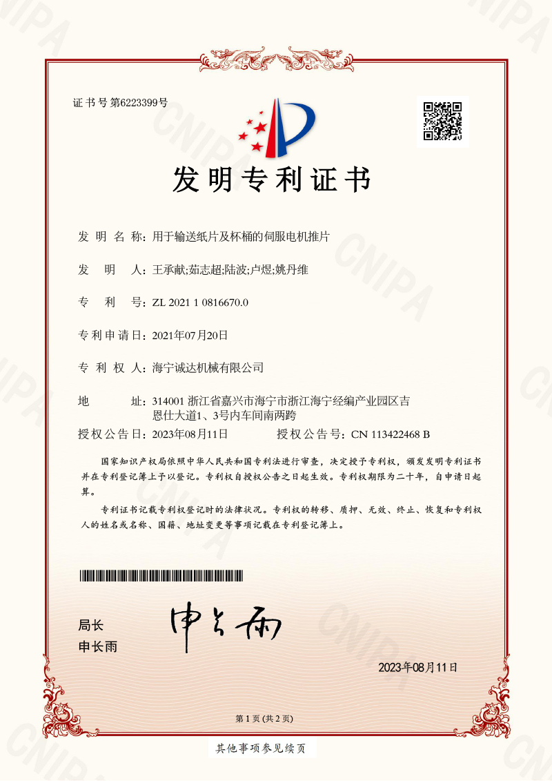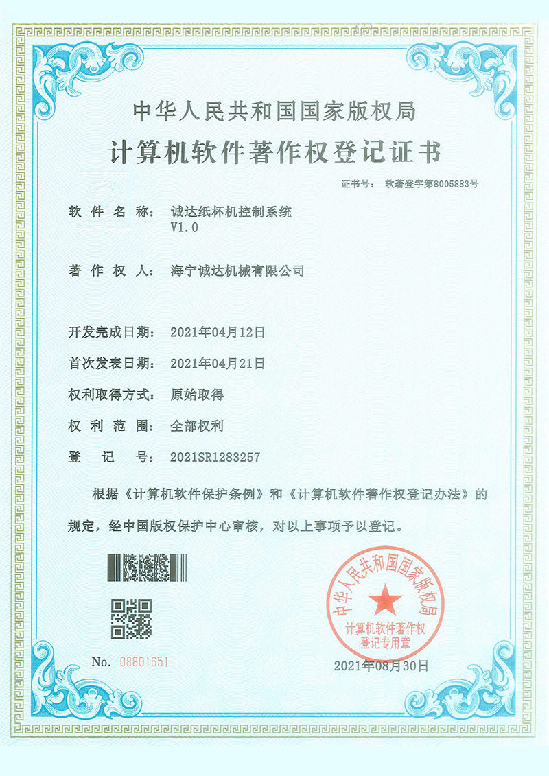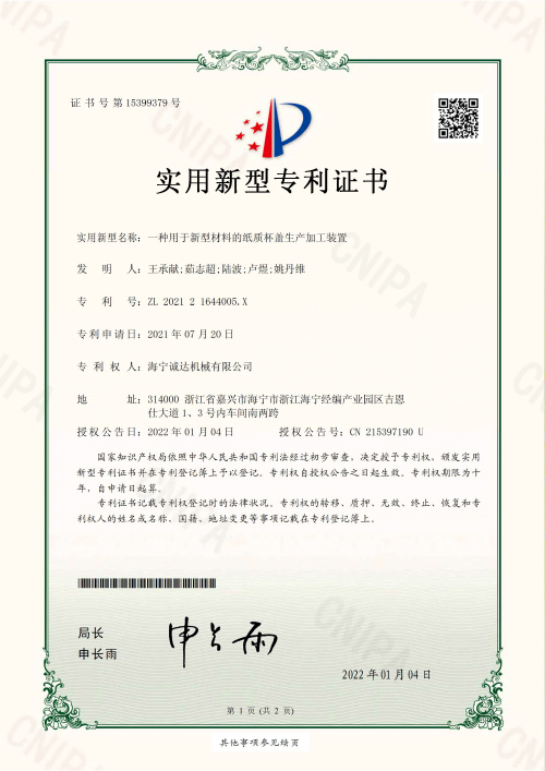 海寧誠達機械有限公司始于1998年,我們公司是一家集紙容器成型機械研發、智造、營銷于一體的專業 設備制造公司。經過20年刻苦鉆研公司已具有雄厚的技術力量,已成立和臺灣資深紙容器成型技術團隊合 作的研發中心,并且獲得直筒機等多項國家專利。公司擁有現代化組裝車間、精密部件加工車間、研發中 心、營銷中心等多個組成部分。